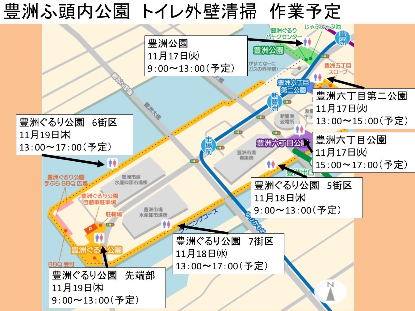 お知らせ 2020年11月10日(火) <作業のご案内>トイレ外壁清掃に伴う一部立ち入り禁止のご案内 Tweet 日頃より、豊洲ふ頭内公園をご利用頂き誠にありがとうございます。 この度、以下の日程で園内トイレの外壁清掃を実施することとなりました。 11月17日㈫-19日㈭ 9:00-17:00(予定) ※公園毎に2~4時間程度、作業予定 外壁清掃作業に伴い、作業の状況に応じて一部立ち入り禁止となりますので、 公園の利用をご検討される際は予めご了承頂きますようお願い申し上げます。 ご不便をおかけしますが何卒ご協力の程よろしくお願い致します。