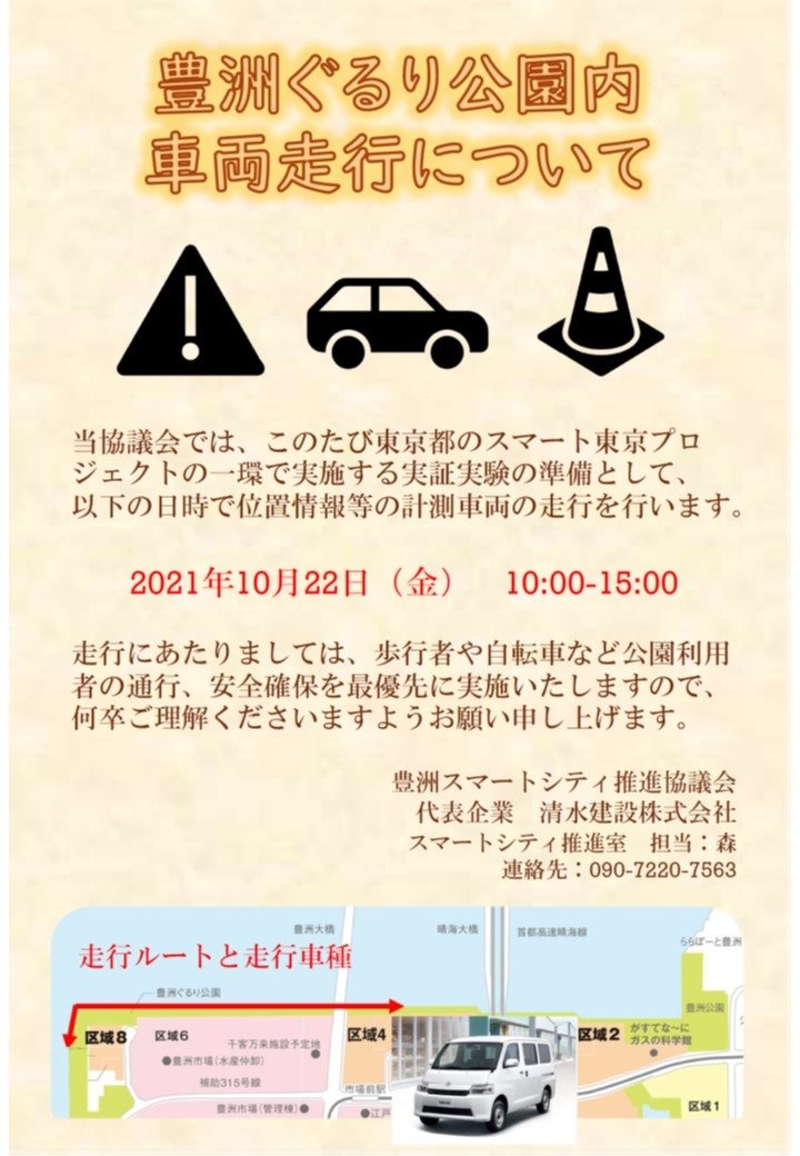 お知らせ 2021年10月14日(木) 10月22日(金) 園内試験走行車両走行のお知らせ Tweet いつも公園をご利用いただき誠にありがとうございます。 この度、東京都のスマート東京プロジェクトの一環で実施する実証実験の準備として、 以下の日程で位置情報等の計測車両の走行を行います。 安全には十分配慮し、利用者の方最優先で実施させて頂きますので、 何卒ご理解くださいますようお願い申し上げます。 日時:2021年10月22日(金) 10:00~15:00 問合せ先:豊洲スマートシティ推進協議会(連絡先は以下の画像参照)