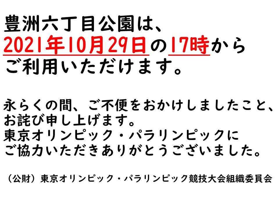 お知らせ 2021年10月27日(水) 豊洲六丁目公園 閉鎖解除のお知らせ Tweet いつも公園をご利用いただき誠にありがとうございます。 オリンピック・パラリンピックの開催に伴って、豊洲六丁目公園の大部分を閉鎖しておりましたが、 10月29日の17時に閉鎖を解除し、通常通りご利用頂けるようになります。 (※芝生の復旧は来年春を予定しており、それまでの間は仮開放となります。) 永らくの間ご不便をおかけしましたこと、お詫び申し上げます。 皆様のご利用をお待ちしております。