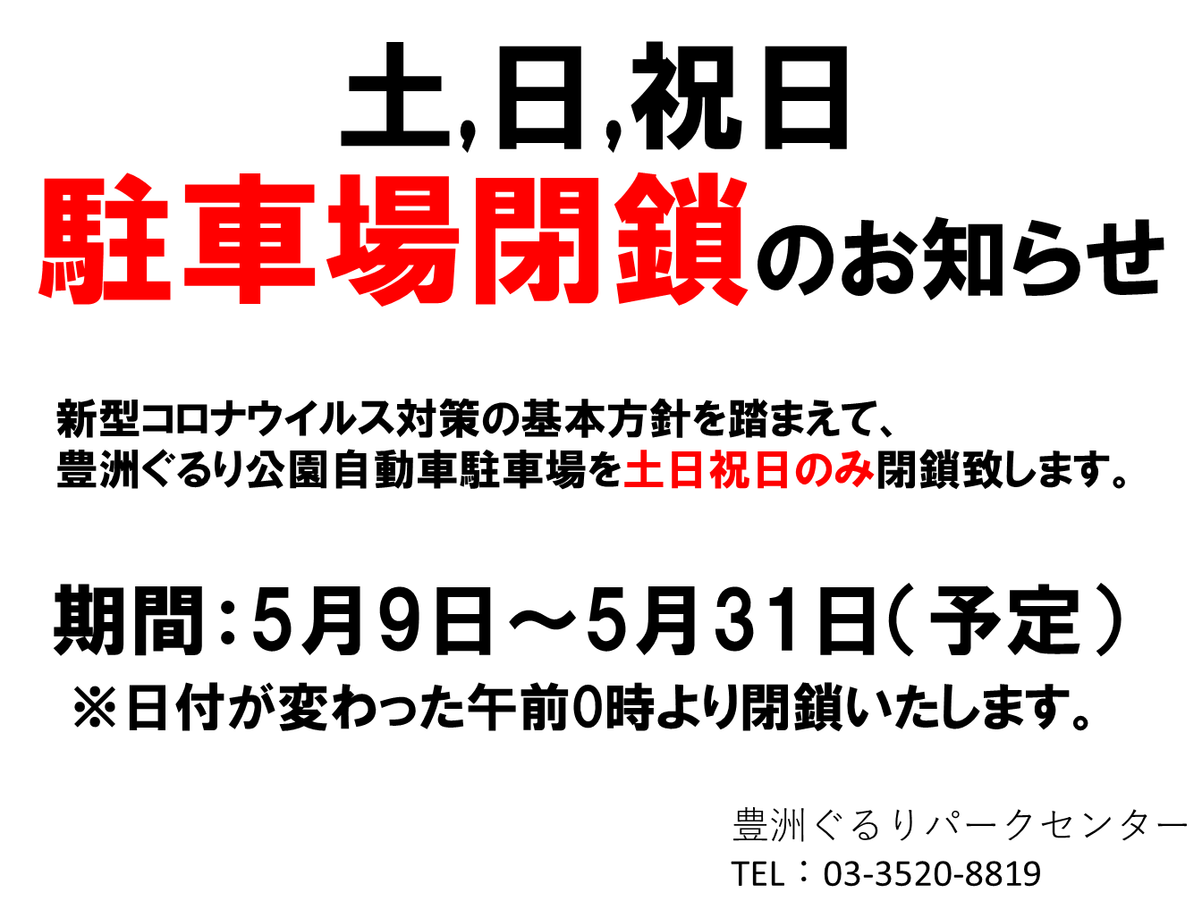 新型コロナウイルス対策の基本方針を踏まえて、 豊洲ぐるり公園自動車駐車場の土日祝日閉鎖の期間を延長致します。 期間:5月9日~5月31日(予定)の土日祝日 日程:5月9日(土)、10日(日)、16日(土)、17日(日) 23...